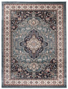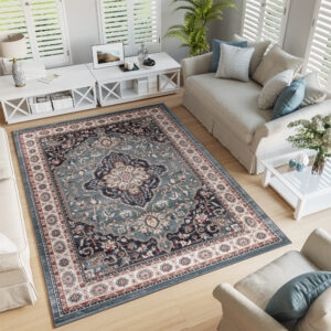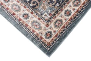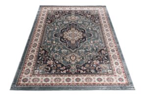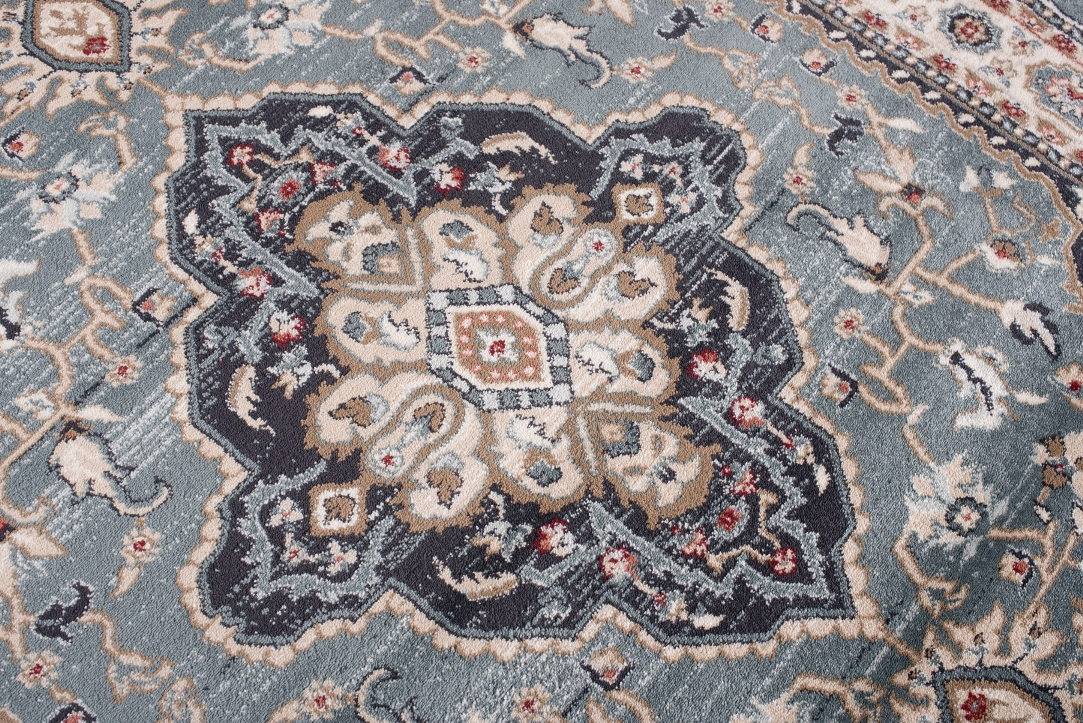 Ten klasyczny dywan w odcieniach niebieskiego i kremowego zachwyca bogatymi ornamentami, które przywodzą na myśl wzory inspirowane tradycją wschodnią. Niebiesko-kremowy dywan z ornamentami wprowadza do wnętrza elegancję i ponadczasowy styl, idealnie komponując się z aranżacjami w stylu klasycznym oraz vintage. Misternie zaprojektowane wzory dodają mu wyrafinowania, czyniąc go ozdobą każdego pomieszczenia – od salonu po gabinet. Niebieskie akcenty na kremowym tle dywanu tworzą harmonijny kontrast, który ożywia przestrzeń, a jednocześnie nie dominuje nad innymi elementami wystroju. Najlepiej prezentuje się na drewnianych podłogach w ciepłych odcieniach.