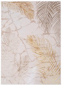 Ten złoto-brązowy dywan z motywem liści i subtelnym efektem 3D to elegancka ozdoba, która wniesie do wnętrza ciepło i wyrafinowany styl. Na kremowym tle rozpościerają się złote i brązowe liście, tworząc trójwymiarową kompozycję, która przyciąga wzrok i dodaje głębi przestrzeni. Taki złoto-brązowy dywan doskonale sprawdzi się w aranżacjach glamour oraz klasycznych, gdzie podkreśli luksusowy charakter wnętrza. Idealnie prezentuje się na ciemnych podłogach, tworząc kontrastową i elegancką całość.