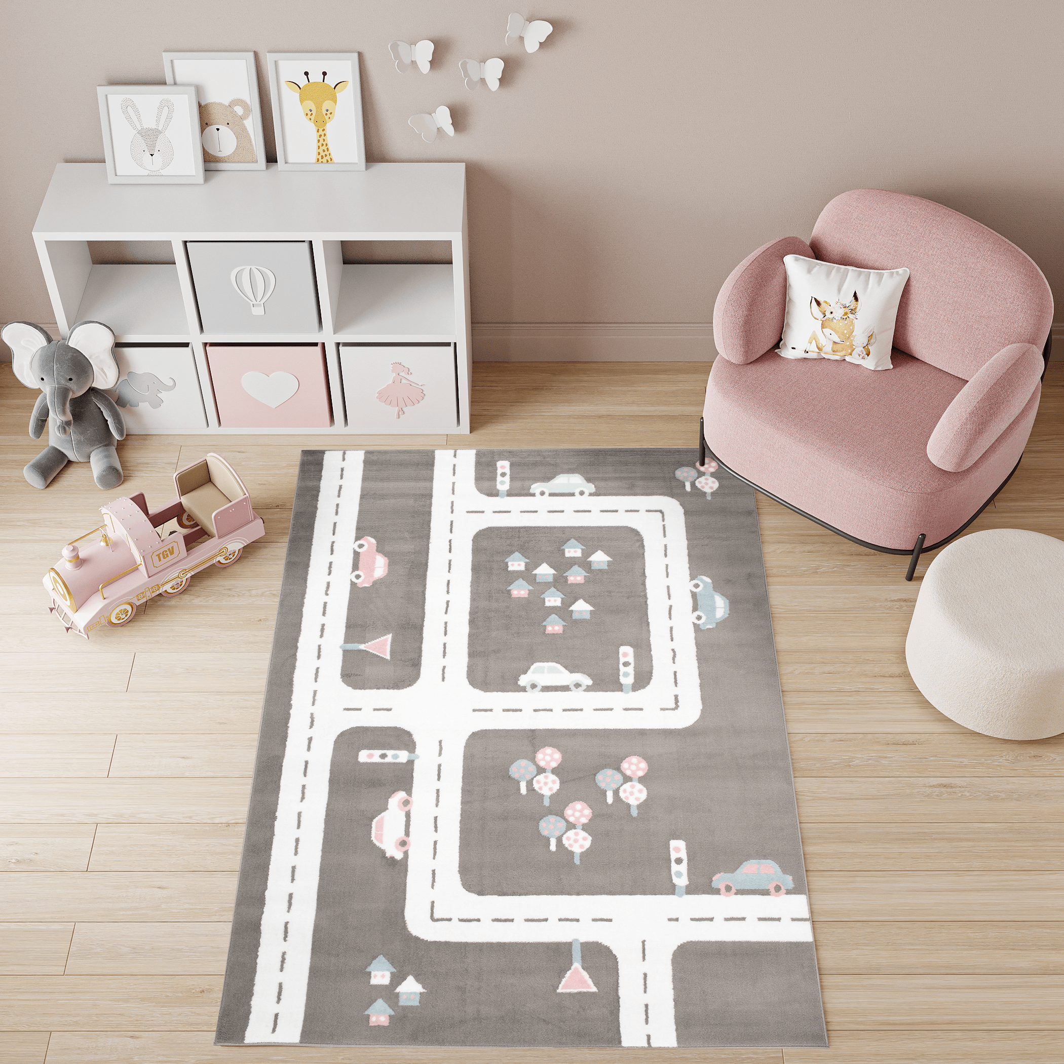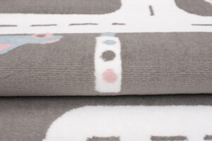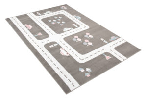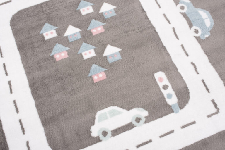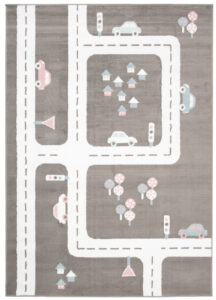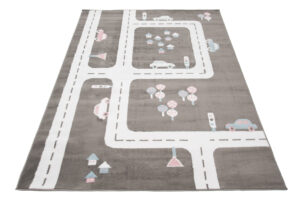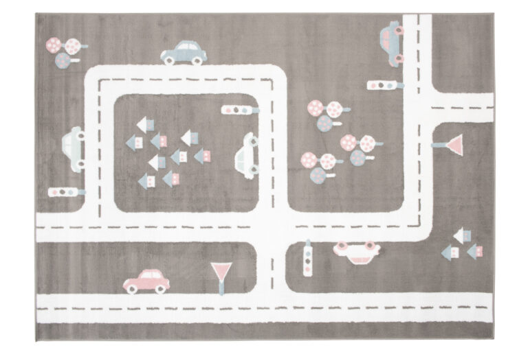 Dywan doskonale komponuje się z pokojami urządzonymi w stylu skandynawskim, nowoczesnym, czy minimalistycznym. Jego neutralna szara baza z białymi ulicami oraz pastelowymi akcentami różu i błękitu pasuje do jasnych i pastelowych mebli, tworząc przyjazną i inspirującą przestrzeń. Dzięki zabawnemu motywowi uliczek i samochodów, dywan ten nie tylko stanowi estetyczny dodatek, ale także zachęca dziecko do kreatywnej zabawy i rozwijania wyobraźni.