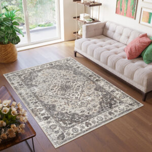 Ten ciemnoszary dywan z subtelną ramką w stylu vintage to doskonały wybór do eleganckich, ale i przytulnych wnętrz. Stonowany odcień ciemnej szarości w połączeniu z delikatnym wzorem ramki tworzy efekt głębi, który wprowadza do pomieszczenia nutę klasycznej elegancji. Ciemnoszary dywan z ramką znakomicie wpisuje się w aranżacje klasyczne oraz glamour, gdzie ciemniejsze kolory i subtelne zdobienia podkreślają szyk i wyrafinowanie przestrzeni.